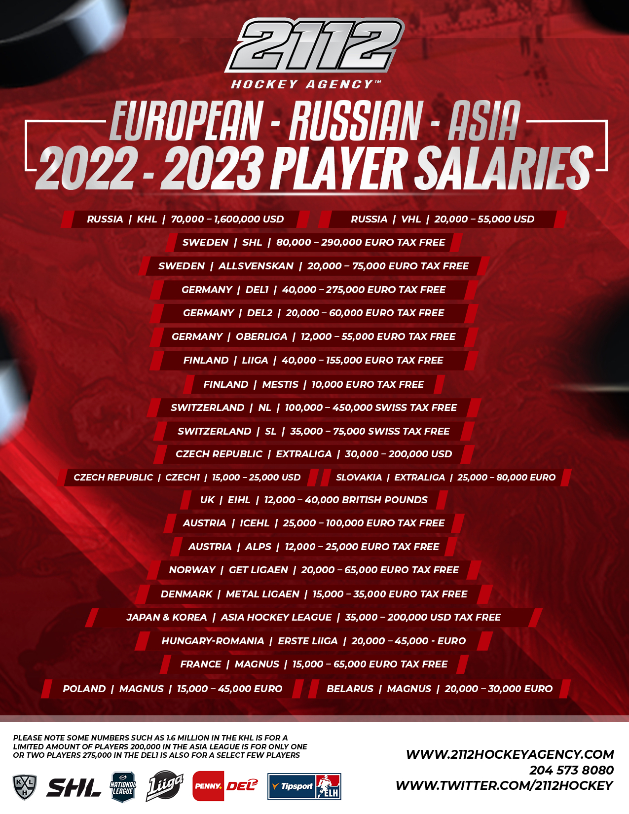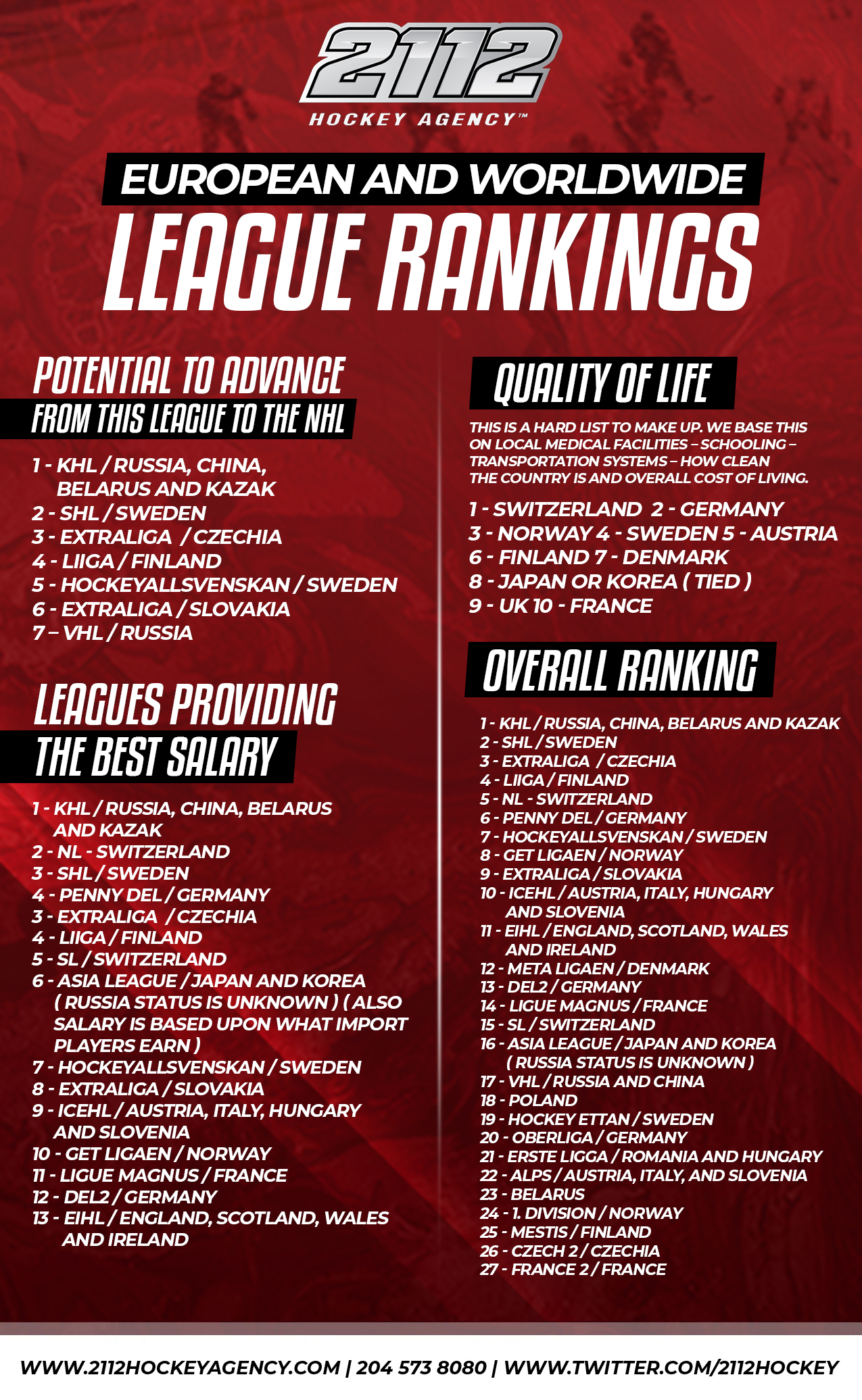I had the pleasure of working with Darryl who left no stone unturned when finding me a place to play. He provided me many options all over Europe with some very prestigious teams and programs. When I decided on the KHL Darryl’s Russian partner Sergey continued the negotiations. Both were always available and extremely knowledgeable when answering any and all of my questions. The entire process was handled very professionally and I would recommend anyone to work with the 2112 agency.
